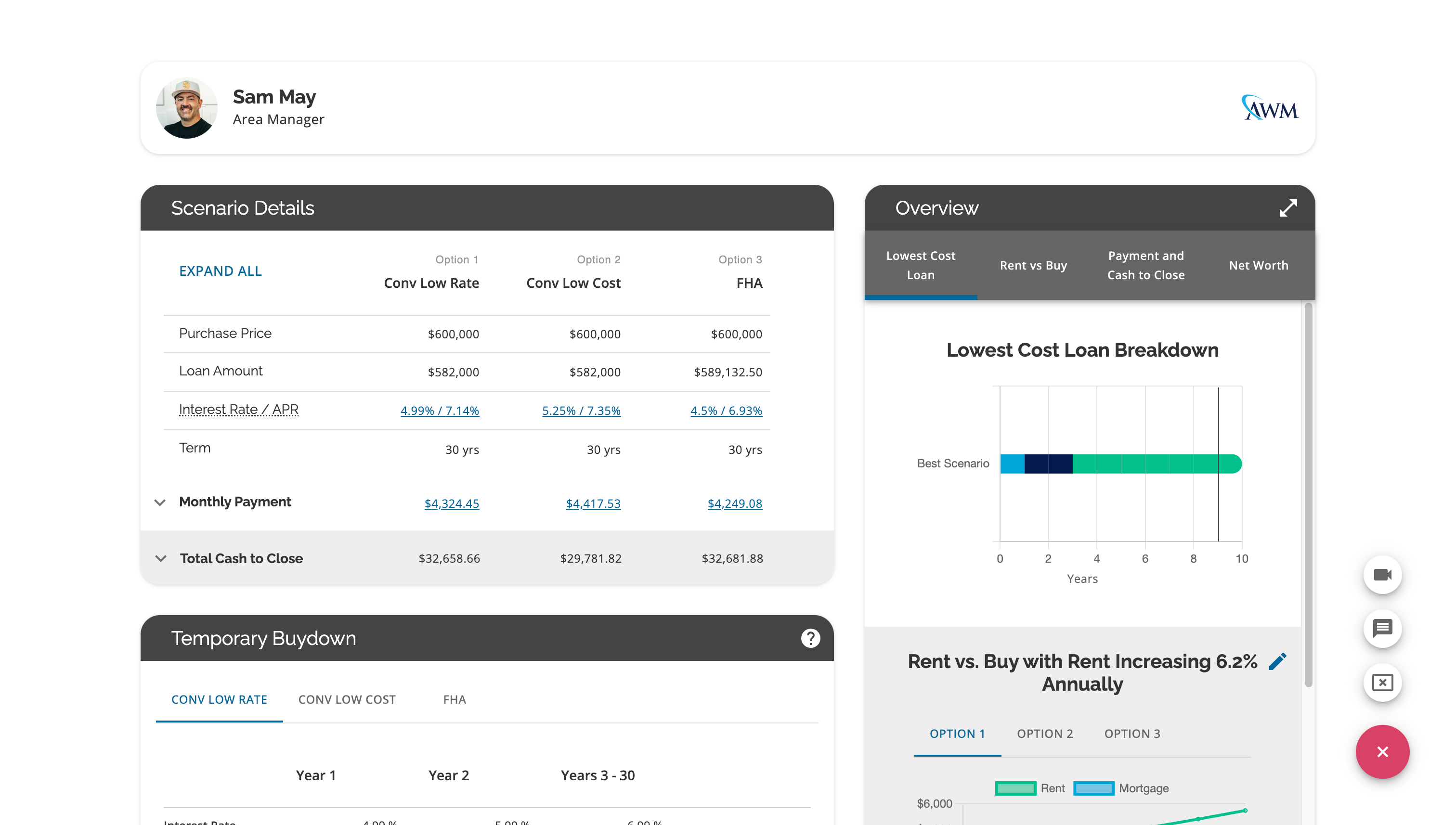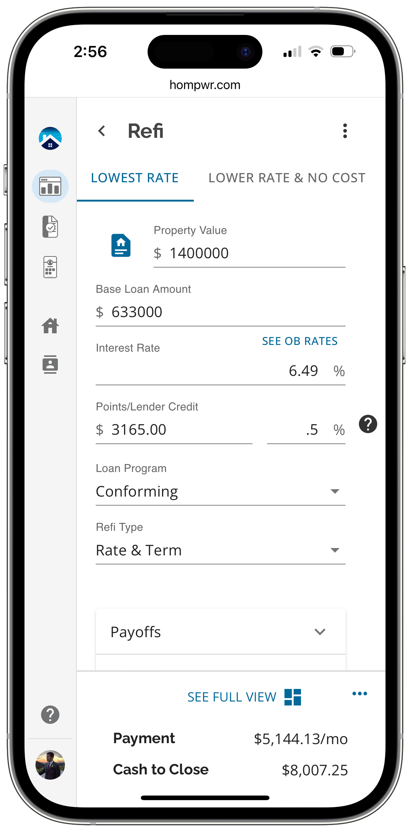 Questions like: "What if my payment stayed the same?" and "What if I paid off the new loan in the same time?" answered with quote-wide updates at the flip of a switch.